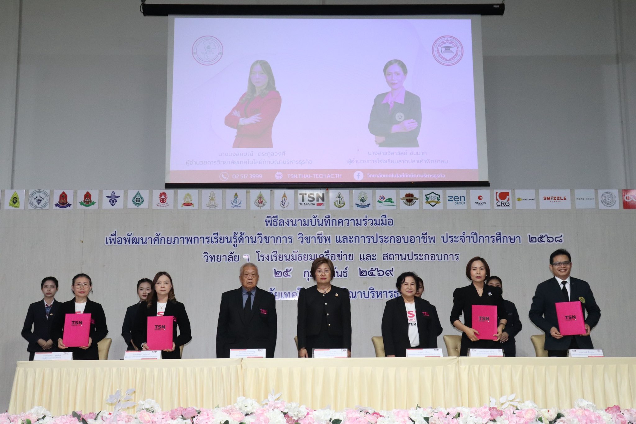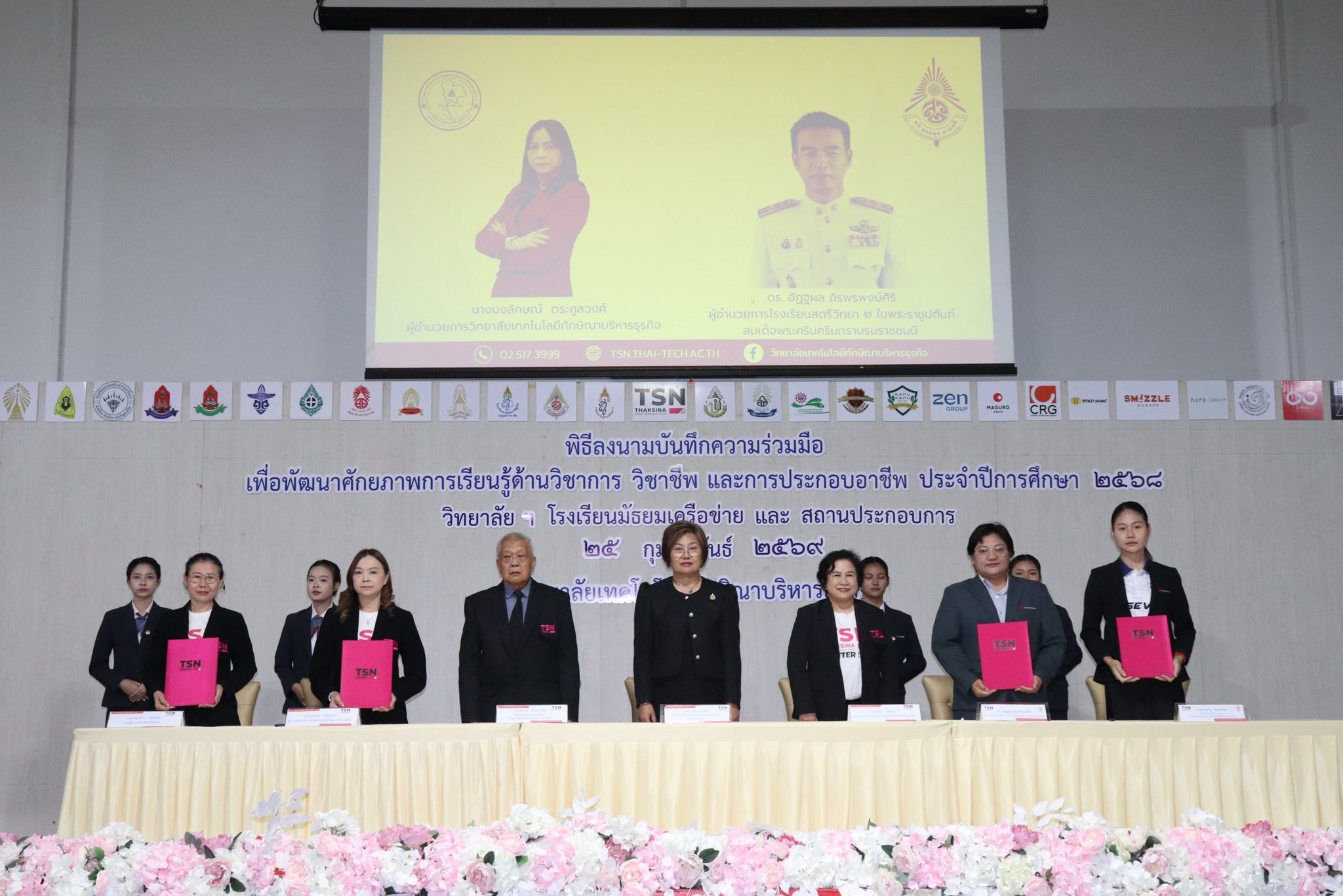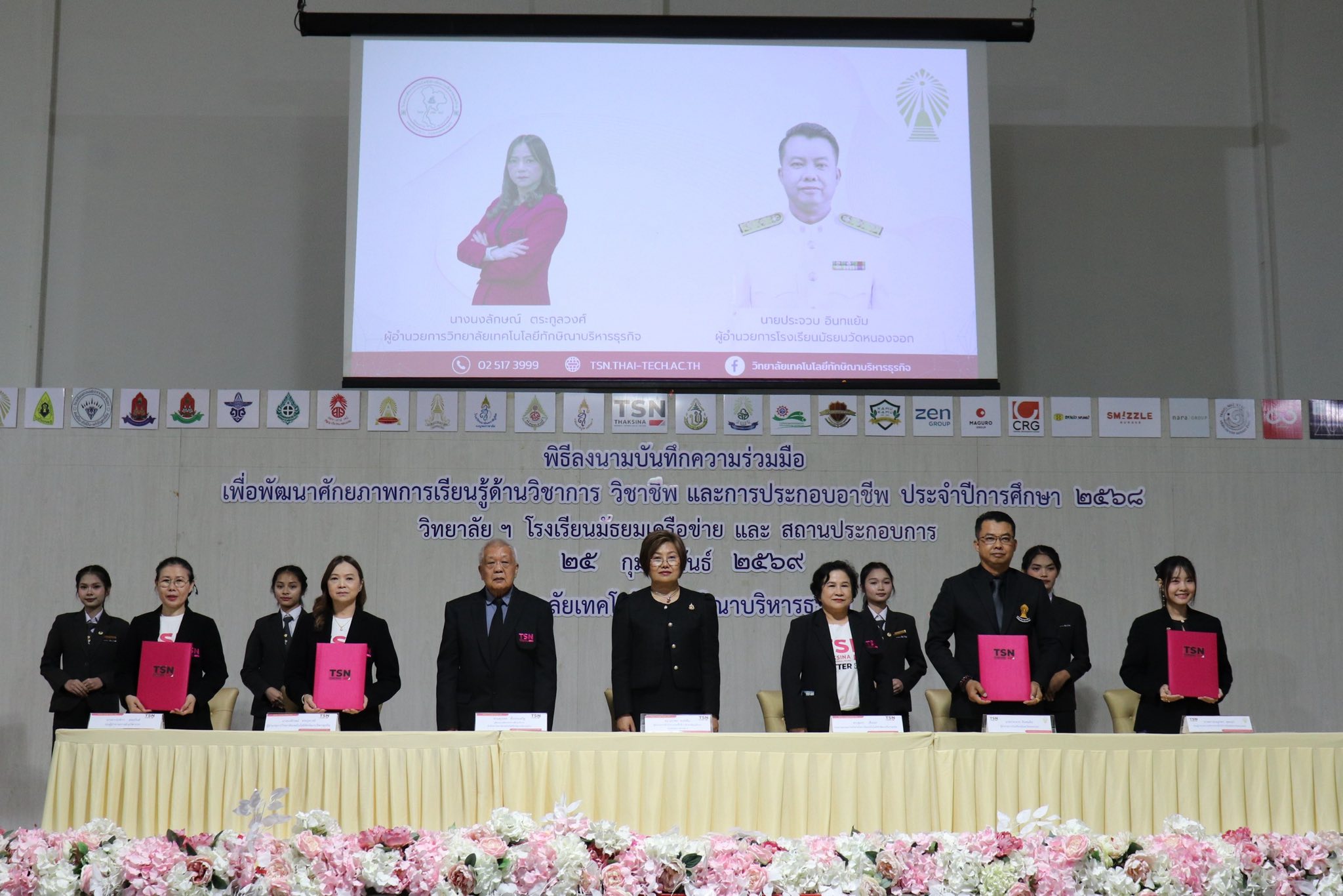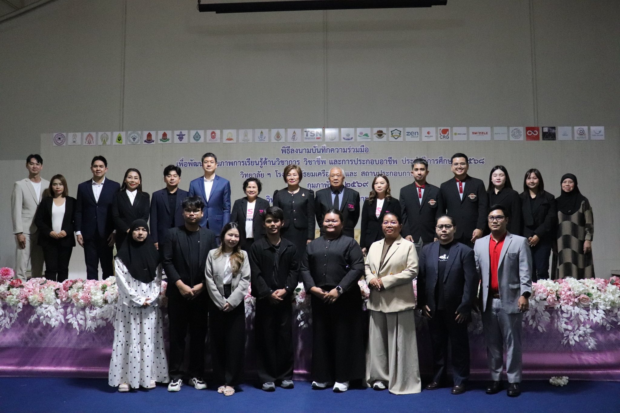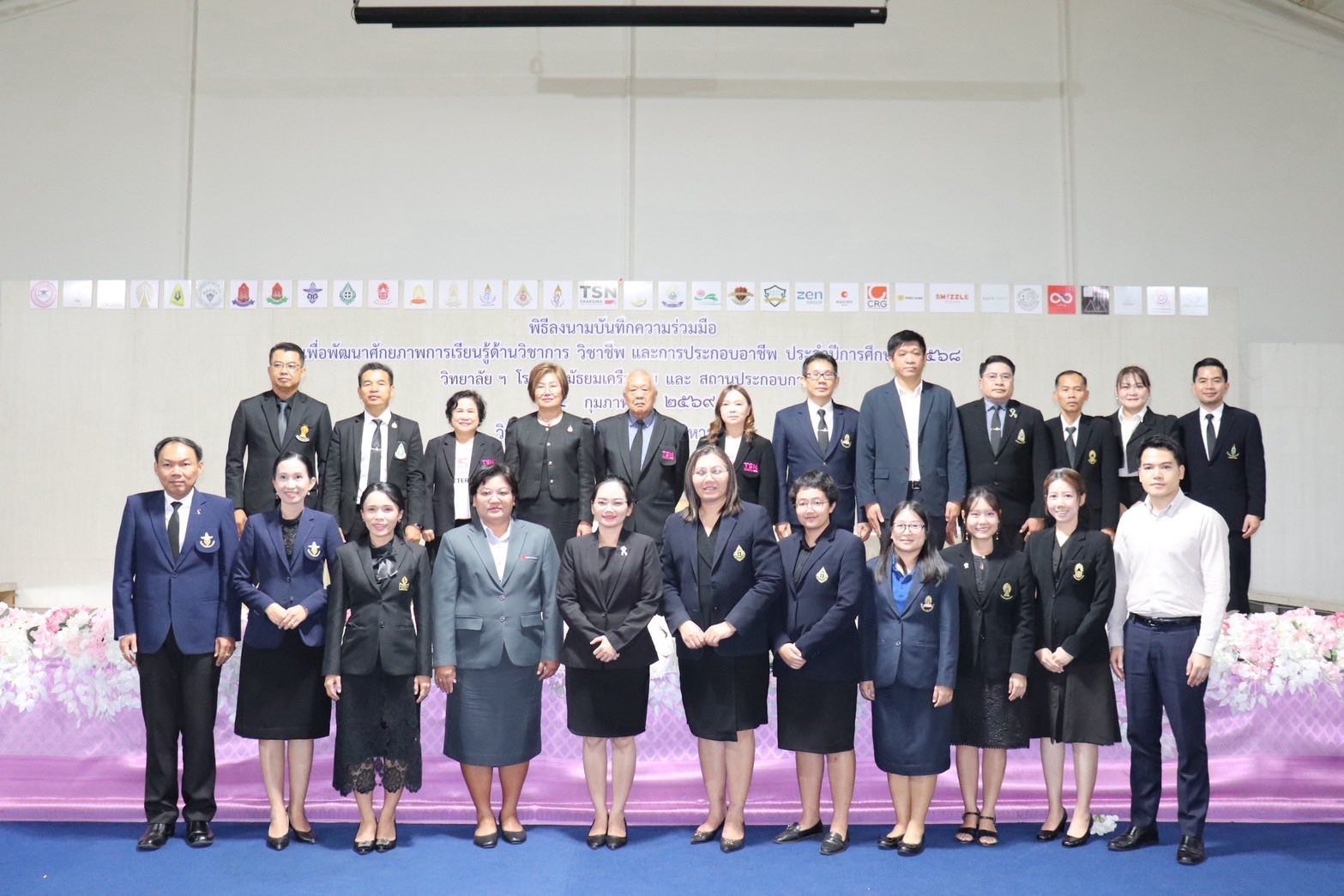 พิธีลงนามบันทึกความร่วมมือ เพื่อพัฒนาศักยภาพการเรียนรู้ ด้านวิชาการ วิชาชีพ และการประกอบอาชีพ ประจำปีการศึกษา 2568 วิทยาลัยฯ โรงเรียนมัธยมเครือข่าย และสถานประกอบการ