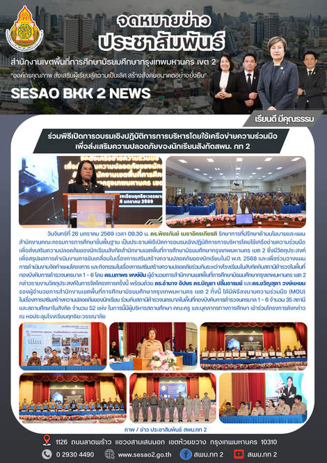 ร่วมพิธีเปิดการอบรมเชิงปฏิบัติการการบริหารโดยใช้เครือข่ายความร่วมมือ เพื่อส่งเสริมความปลอดภัยของนักเรียนสังกัด สพม.กท 2