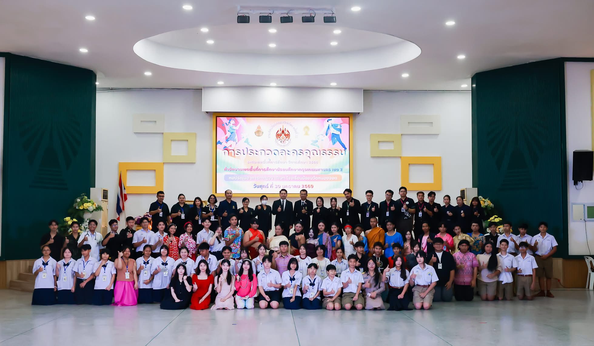 | วันศุกร์ที่ 30 มกราคม 2569 เวลา 08.00 น. ดร.นภาพร พงษ์ขัน ผู้อำนวยการสำนักงานเขตพื้นที่การศึกษามัธยมศึกษากรุงเทพมหานคร เขต 2 มอบหมายให้ ดร.บัญชา ปลื้มอารมย์ รองผู้อำนวยการสำนักงานเขตพื้นที่การศึกษามัธยมศึกษากรุงเทพมหานคร เขต 2 เป็นประธานในพิธีเปิดการแข่งขันศิลปหัตถกรรมนักเรียน ระดับเขตพื้นที่การศึกษา ครั้งที่ 73 ปีการศึกษา 2568 โดยโรงเรียนมัธยมวัดหนองจอก ได้รับมอบหมายให้เป็นศูนย์การแข่งขันกลุ่มสาระการเรียนรู้สังคมศึกษา ศาสนา และวัฒนธรรม ซึ่งดำเนินการจัดการแข่งขันประกวดละครคุณธรรม มีทีมเข้าร่วมการแข่งขัน จำนวน 11 ทีม นักเรียนทั้งสิ้น 165 คน ณ โรงเรียนมัธยมวัดหนองจอก |