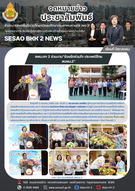 | วันศุกร์ที่ 3 เมษายน 2569 เวลา 10.00 น. ดร.นภาพร พงษ์ขัน ผู้อำนวยการสำนักงานเขตพื้นที่การศึกษามัธยมศึกษากรุงเทพมหานคร เขต 2 พร้อมด้วย ดร.อำนาจ อัปษร ดร.ขวัญสุดา วงษ์แหยม รองผู้อำนวยการสำนักงานเขตพื้นที่การศึกษามัธยมศึกษากรุงเทพมหานคร เขต 2 นำผู้บริหารสถานศึกษาในสังกัด ร่วมงาน”ร้อยรักร่วมใจ ประเพณีไทย สบพม.2“ จัดโดยสมาคมผู้บริหารเขตพื้นที่การศึกษามัธยมศึกษา เขต 2 ร่วมกับสำนักงานเขตพื้นที่การศึกษามัธยมศึกษากรุงเทพมหานคร เขต 2 ซึ่งมีวัตถุประสงค์เพื่อแสดงความเคารพต่อผู้บริหารอาวุโสและเป็นการสร้างความรักความสามัคคีของผู้บริหารในสังกัด โดยมี นายสุรเทพ ตั๊นประเสริฐ อดีตรองปลัดกระทรวงศึกษาธิการ เป็นประธานในพิธี ณ หอประชุมชำนิประศาสน์ โรงเรียนบดินทรเดชา (สิงห์ สิงหเสนี) ๒ |