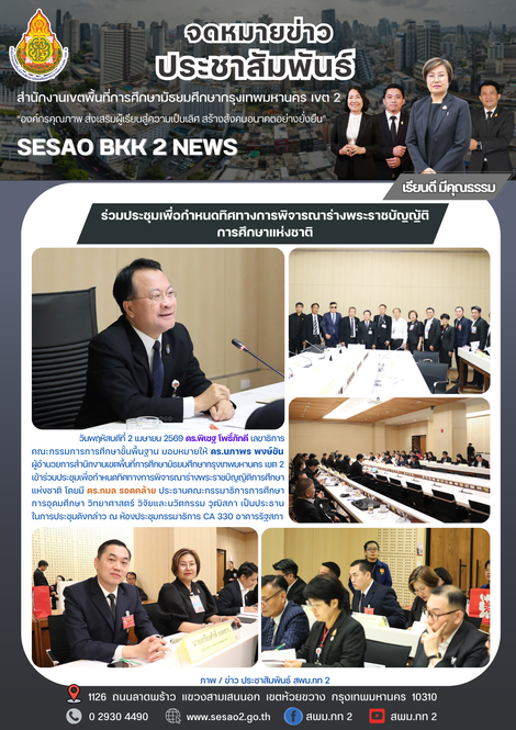| วันพฤหัสบดีที่ 2 เมษายน 2569 ดร.พิเชฐ โพธิ์ภักดี เลขาธิการคณะกรรมการการศึกษาขั้นพื้นฐาน มอบหมายให้ ดร.นภาพร พงษ์ขัน ผู้อำนวยการสำนักงานเขตพื้นที่การศึกษามัธยมศึกษากรุงเทพมหานคร เขต 2 เข้าร่วมประชุมเพื่อกำหนดทิศทางการพิจารณาร่างพระราชบัญญัติการศึกษาแห่งชาติ โดยมี ดร.กมล รอดคล้าย ประธานคณะกรรมาธิการการศึกษา การอุดมศึกษา วิทยาศาสตร์ วิจัยและนวัตกรรม วุฒิสภา เป็นประธานในการประชุมดังกล่าว ณ ห้องประชุมกรรมาธิการ CA 330 อาคารรัฐสภา |